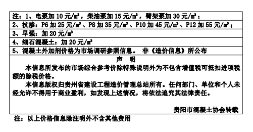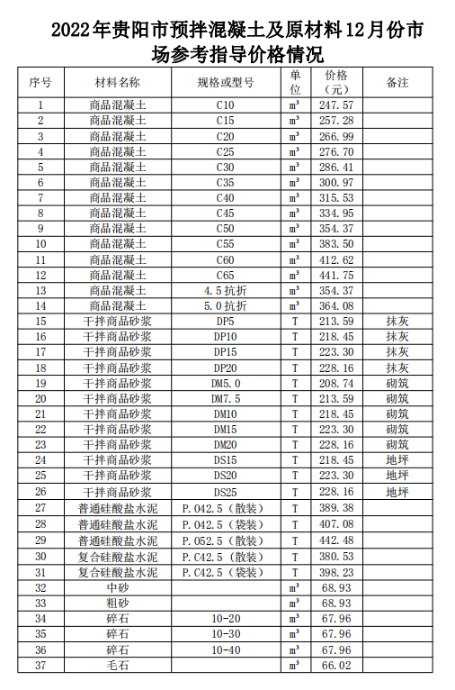 2022年贵阳市预拌混凝土及原材料12月份市场参考指导价格情况
